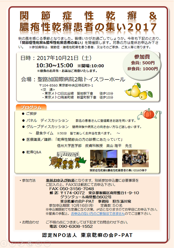 10/21(土)関節症性乾癬&膿疱性乾癬患者さん集まれ~!