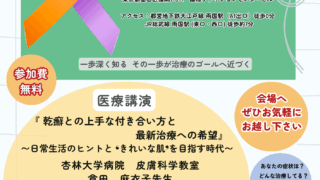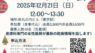 12/21(日)ウィメンズランチ会を開催します! 12/15申込期限/先着15名 全国の女性乾せん患者さん限定、12/21にランチ会を開催します。患者さんとご家族、ご友人の女性も参加できます。みなさん、クリスマスや年末が近い忙しい時期ではありますが、アクセス抜群の東京駅です。ぜひお気軽にご参加ください。皮膚科専門の女医さ... 2025.11.07 トピックスニュース